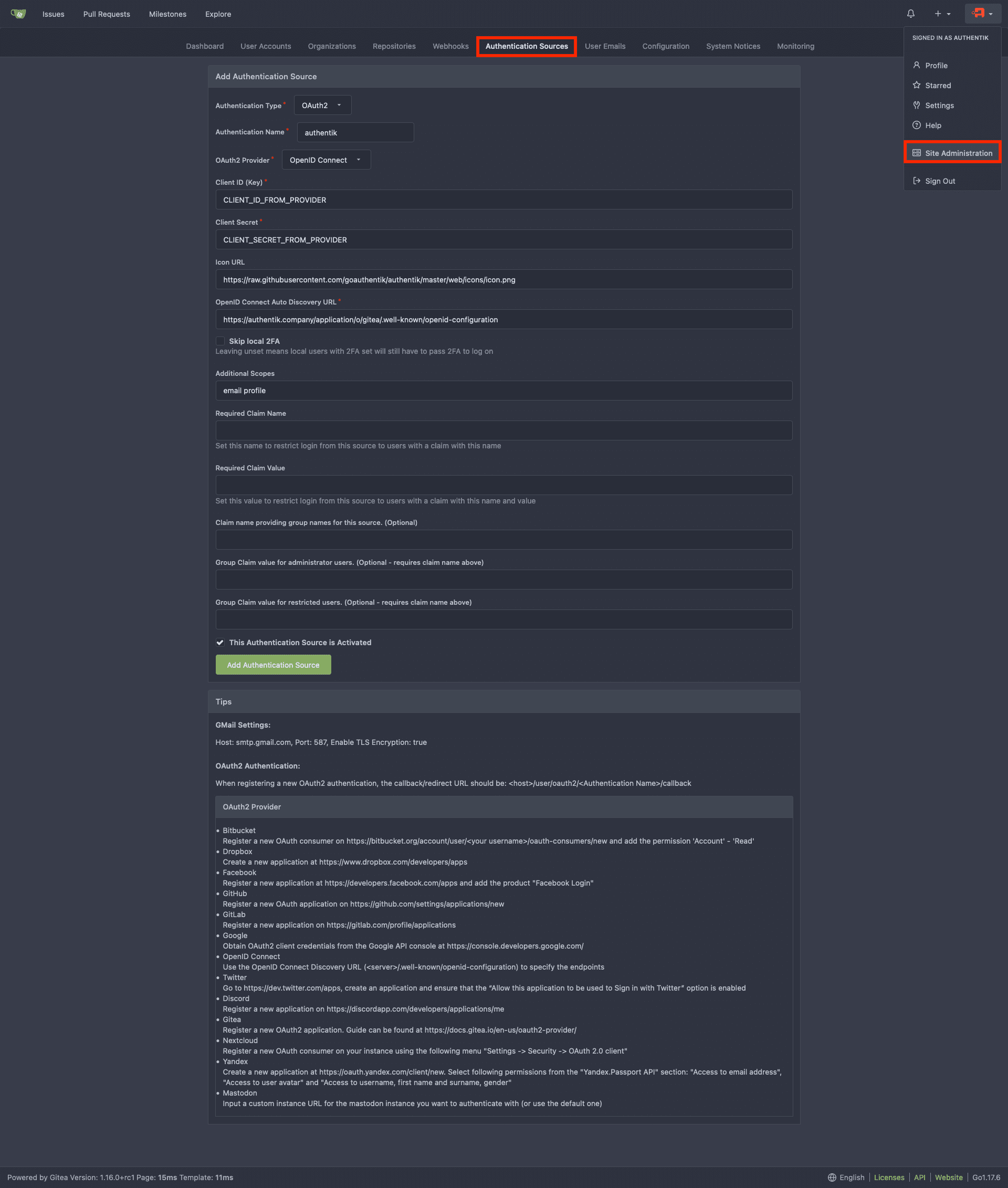 2. Select the Authentication Sources tab and edit the authentik Authentication Source.